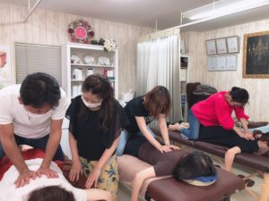 講話に関しては、解剖学や筋肉などの本などでも学ぶことはできますが、今回の勉強会ではセラピスト同士、相モデルになりながらの勉強会。