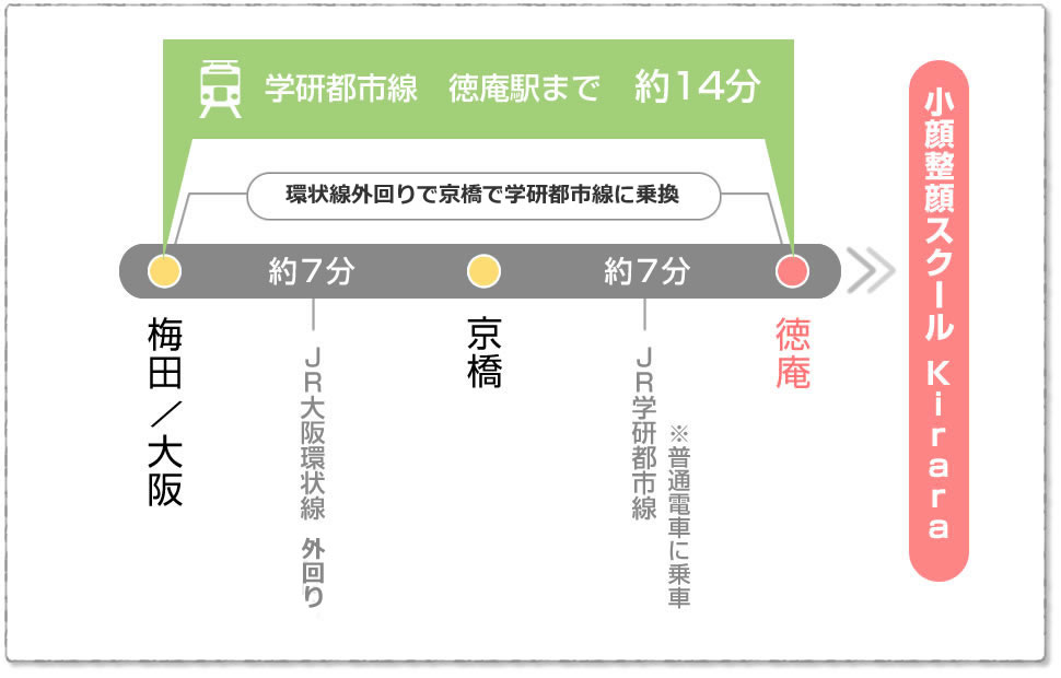●兵庫方面からお越しの方 JR東西線「尼崎駅」(快速または区間快速乗車 )⇒「京橋駅」(JR学研都市線・普通電車に乗換)⇒「徳庵駅」 約25分